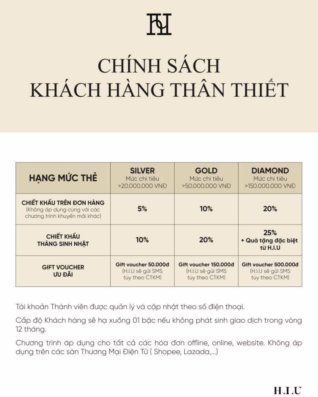 Tất cả khách hàng khi mua sắm tại các cửa hàng trong hệ thống 𝐇.𝐈.𝐔 hoặc qua online đều được tham gia tích điểm. Số điểm tích lũy tương đương với giá trị thực của đơn hàng.
